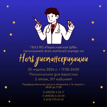 Для тех, кому проблематично в плотном рабочем графике найти время на медицинское обследование, Переславская ЦРБ осваивает новый формат взаимодействия с жителями круга. В поликлинике 20 марта пройдёт «Ночь диспансеризации». Пройти профилактический осмотр или диспансеризацию желающие смогут не в обычные часы приема, а с 17:00 до 24:00.
